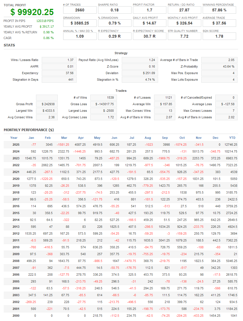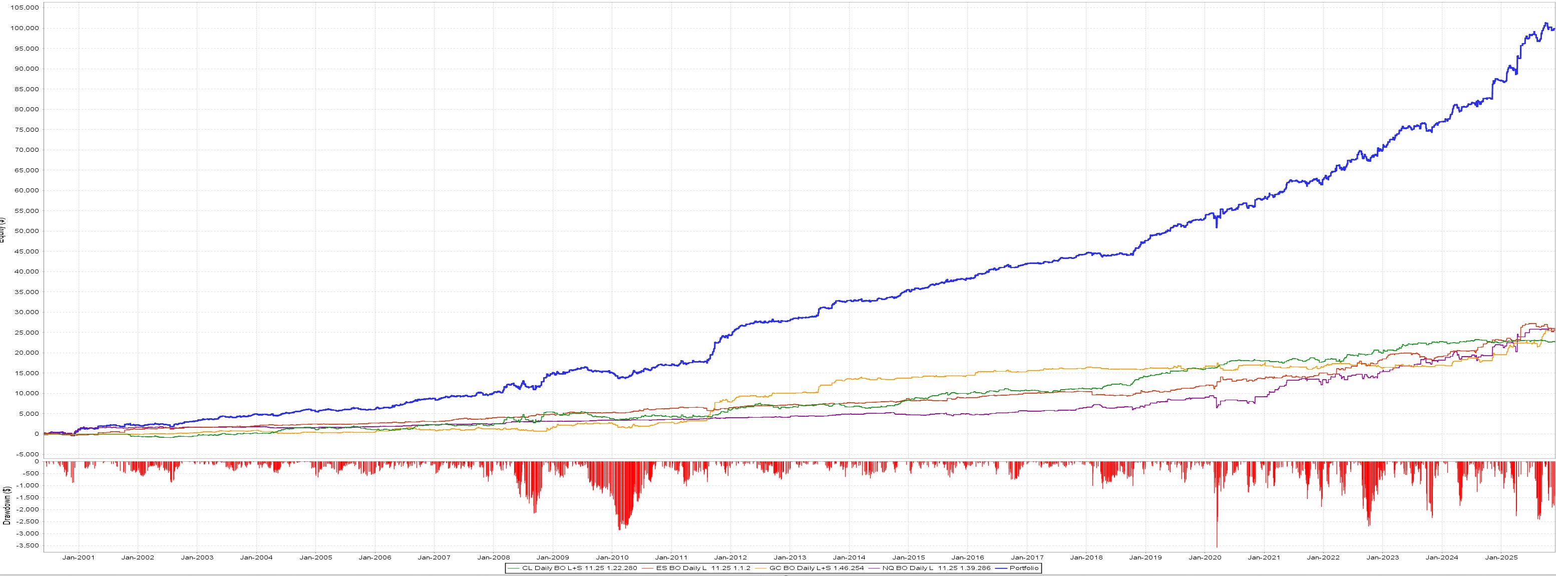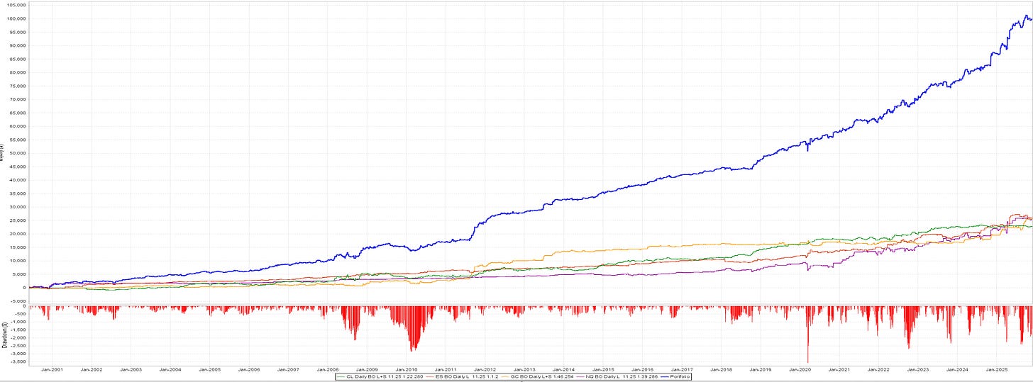 Contracts & sizing: analysis uses the most liquid Micro contracts. Running on E-minis is roughly 10× the P&L and drawdown. Results below are one contract, no compounding for fair comparison.