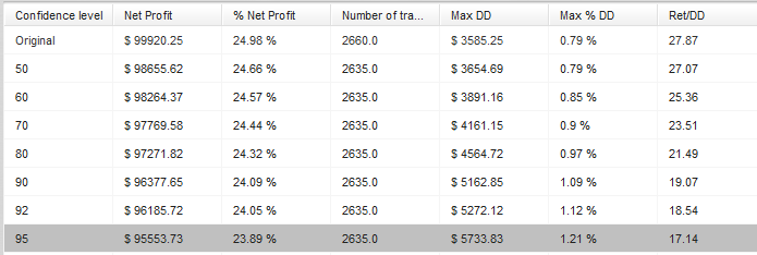 Portfolio Monte Carlo: even at the 95 percent worst case, return to drawdown remains strong.
