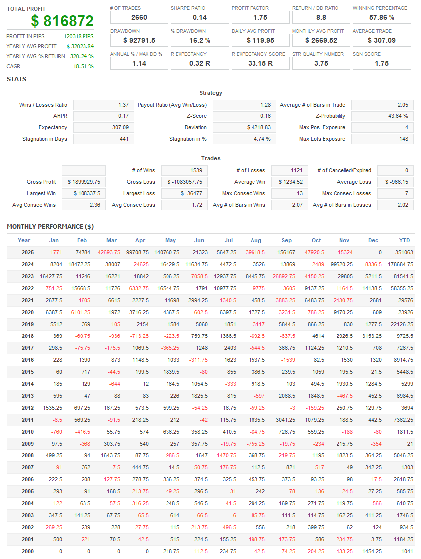 For compounding: starting with $10,000 and using percentage based position sizing, the portfolio delivered an 18 percent CAGR and an 8,068 percent return on capital over 24 years. (10x the profit and drawdown for E-minis)